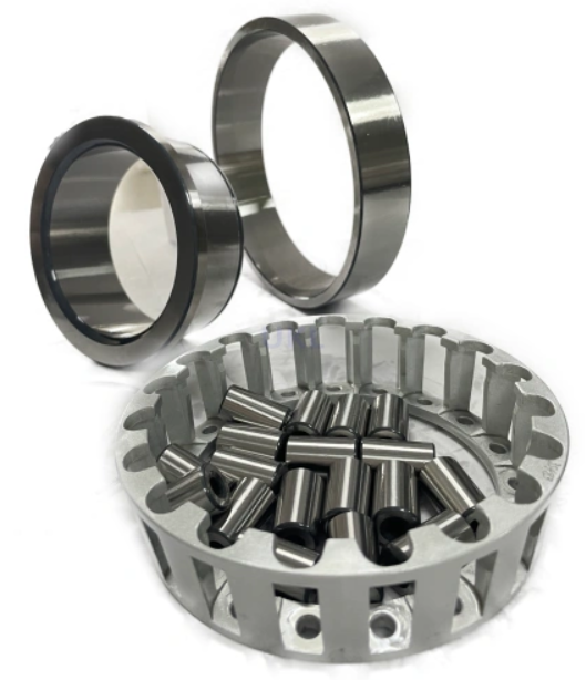Four-row tapered roller bearings can accommodate combined (radial and axial) loads at low to moderate speeds. They are used almost exclusively in work roll applications such as rolling mills.