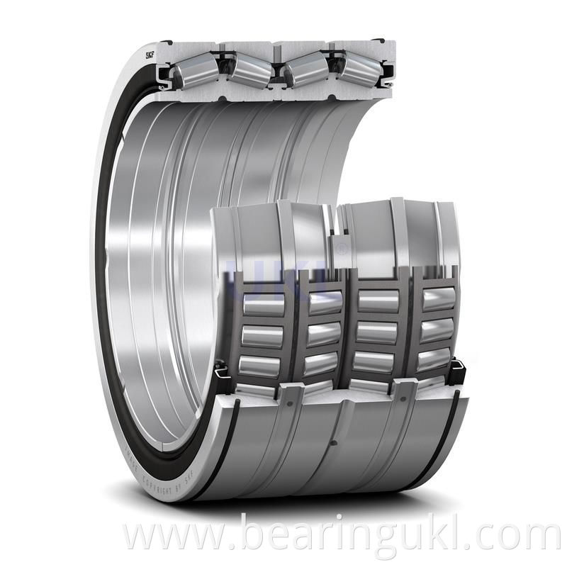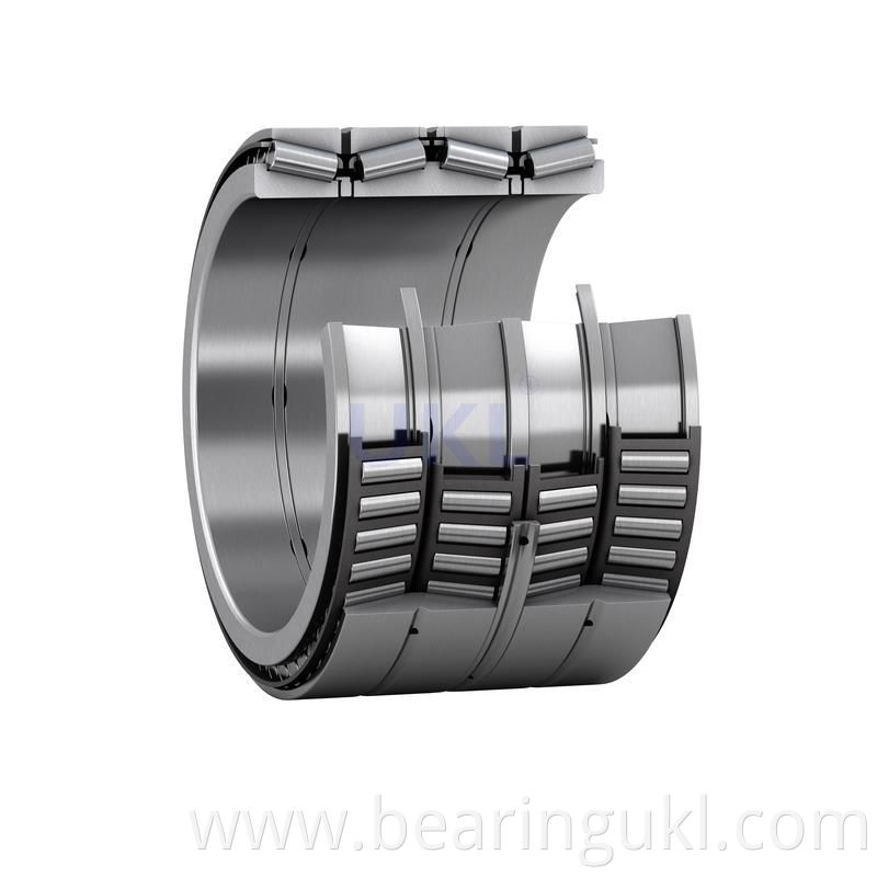 Four-row tapered roller bearings can accommodate combined (radial and axial) loads at low to moderate speeds. They are used almost exclusively in work roll applications such as rolling mills.