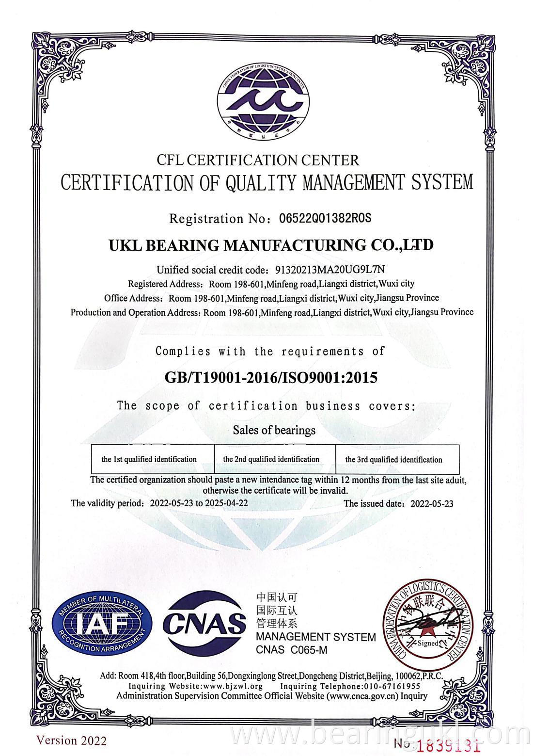 UKL Bearing Manufacturing Co.,Ltd. was found in 2020, which is affiliated to UKL Group and is the WUXI sales office on bearings. We located in beautiful city, Wuxi which takes 40 minutes on train to Shanghai. We dedicates to both bearing manufacturing and trading with a professional team. OEM and ODM service can be supplied. The bearing is customized according to customers'drawing.