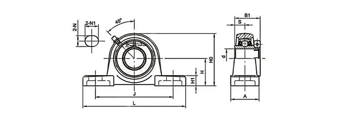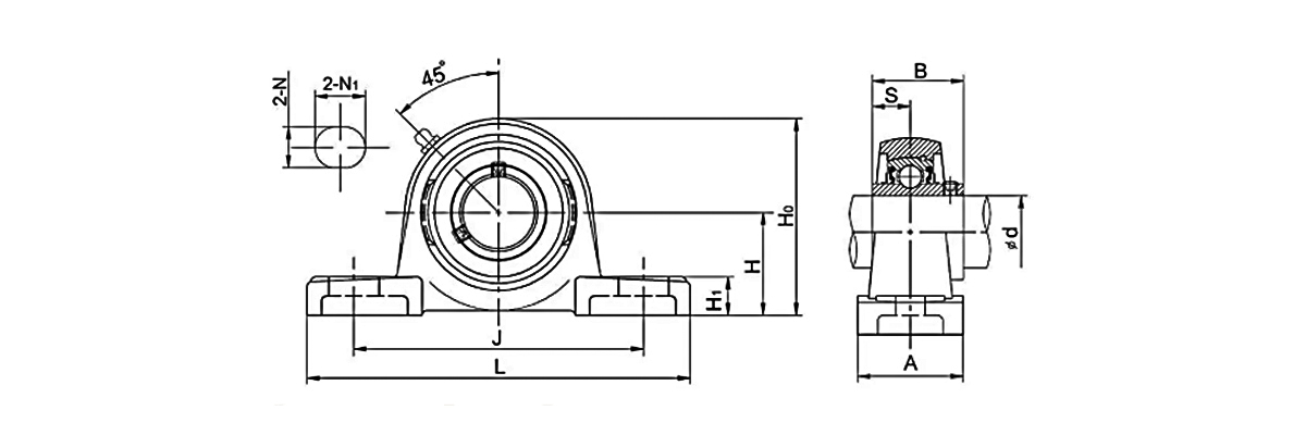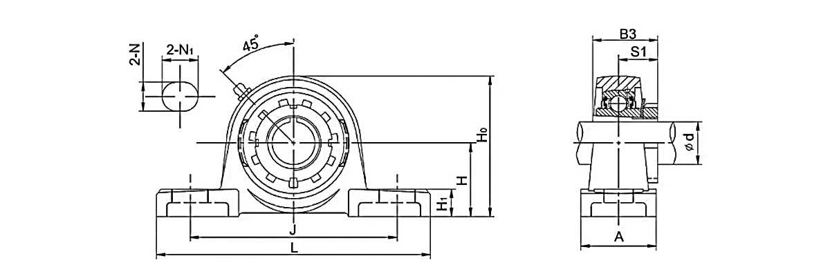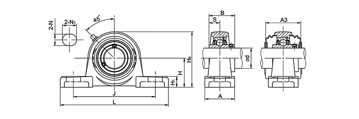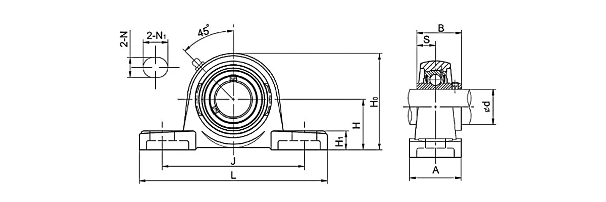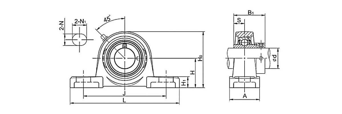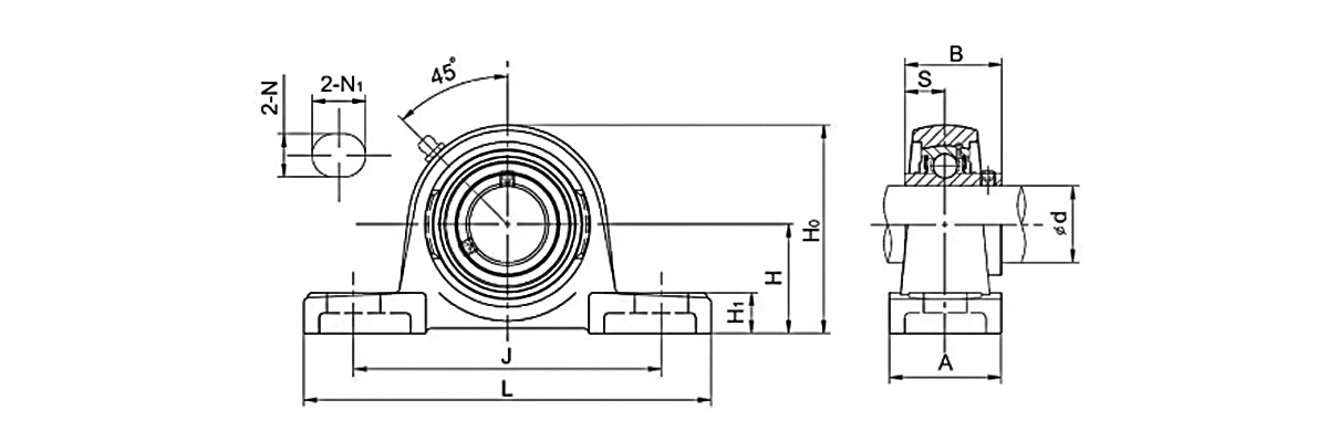 This type of bearing contains a mounting block (pillow block). The bearing is installed inside the mounting block.